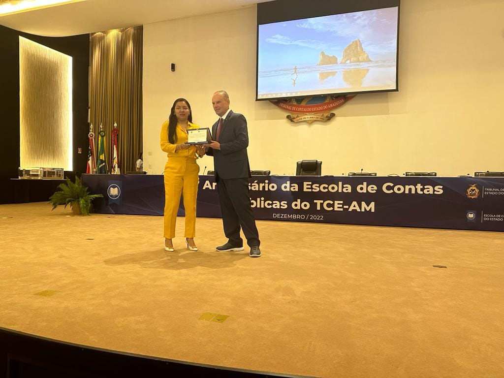 Presidente do CRCAM recebe placa de homenagem de representante de entidades órgãos parceirosda Escola de Contas Públicas do TCE/AM