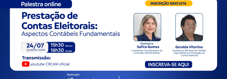 O Conselho Regional de Contabilidade do Amazonas (CRCAM), realizará uma palestra sobre Prestação de Contas Eleitoral. A coordenadora da Comissão CRCAM Mulher, Safira Gomes, conduzirá o diálogo com a contadora, bacharel em direito e especialista em Prestação de Contas Eleitoral, Geralda Vitorino.